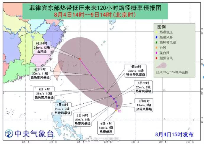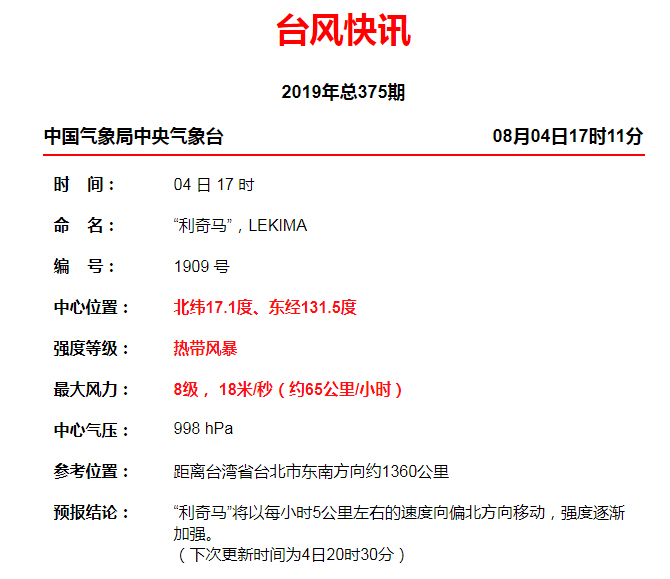 今年第9號(hào)臺(tái)風(fēng)"利奇馬"(熱帶風(fēng)暴級(jí))(英文名稱:LEKIMA;名字來(lái)源:越南;名字意義:一種水果)已于4日下午在西北太平洋洋面生成,17時(shí)其中心位于我國(guó)臺(tái)灣省臺(tái)北市東南方約1360公里的西北太平洋洋面上,中心附近最大風(fēng)力8級(jí)(18米 /秒),中心最低氣壓998百帕,七級(jí)風(fēng)圈半徑250-420公里。