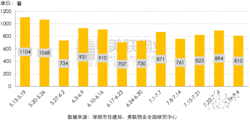 7月29日-8月4日一周內(nèi),全市共簽約成交一手住宅810套/7.7萬(wàn)㎡,環(huán)比分別下降9.4%和10.2%。成交量連續(xù)兩周環(huán)比增長(zhǎng)之后,出現(xiàn)了大約1成的下降。