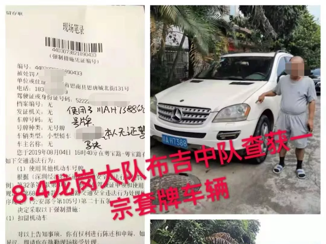 8月4日17時(shí)許,深圳交警在龍崗區(qū)查獲一輛套牌嫌疑車輛川AH7388。經(jīng)核查,司機(jī)還存在無證駕駛違法行為。目前,該案正在進(jìn)一步調(diào)查中。