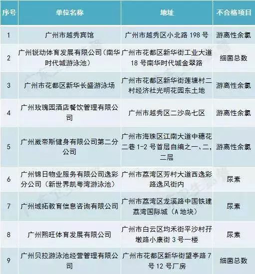 廣東省部分城市游泳場所水質抽檢不合格場所名單(第一批)