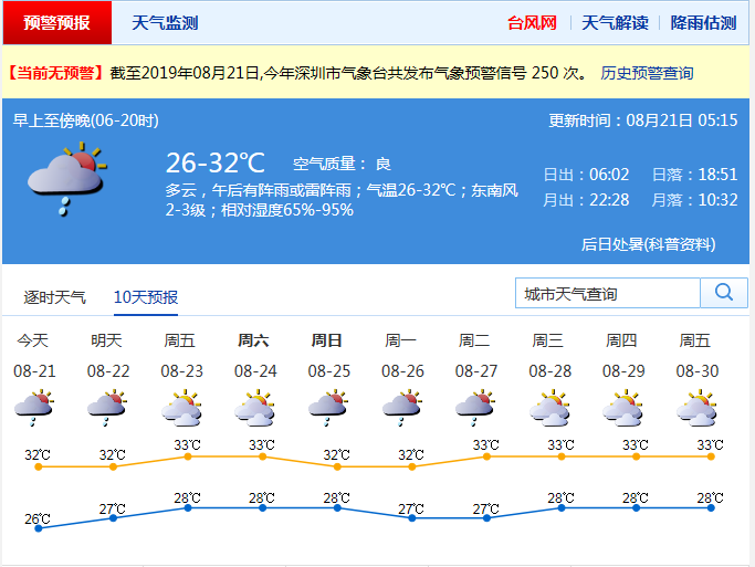 見圳客戶端·深圳新聞網(wǎng)2019年8月21日訊(見圳客戶端·深圳新聞網(wǎng)記者 高暢韻)記者從市氣象局了解到,昨日我市白天最高氣溫31 ℃ -33 ℃,中北部最高氣溫達(dá)到35 ℃。今日多云,有(雷)陣雨;22-24日多云間晴天,局部有短時(雷)陣雨,部分地區(qū)最高氣溫可達(dá)35 ℃左右;25-26日有(雷)陣雨,氣溫有所回落。