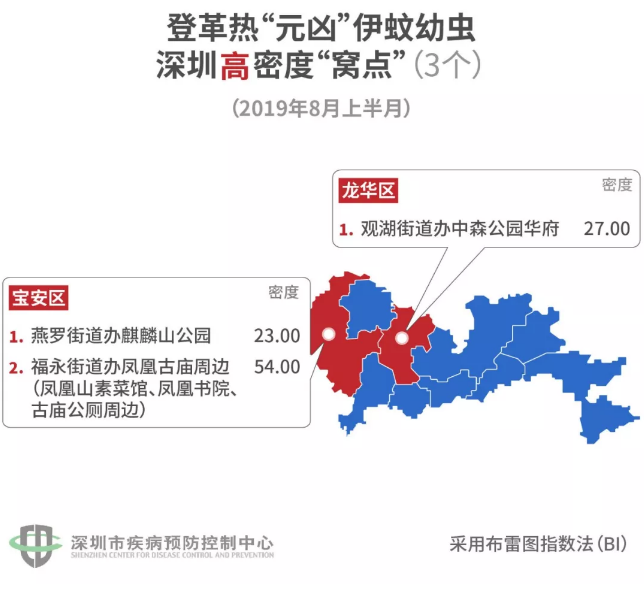 2019年8月1日-15日,通過對全市419個監(jiān)測點進行伊蚊密度監(jiān)測,發(fā)現深圳蚊媒密度總體較高,不符合防控要求的監(jiān)測點有237個,占了56.56%,其中——高傳播風險的有3個點;中度傳播風險的有64個點;低度傳播風險的有179個。