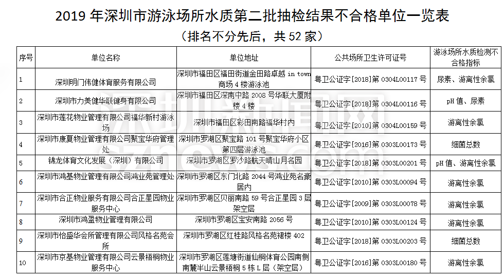見(jiàn)圳客戶(hù)端·深圳新聞網(wǎng)2019年8月29日訊(見(jiàn)圳客戶(hù)端、深圳新聞網(wǎng)記者 劉夢(mèng)婷 通訊員 深衛(wèi)監(jiān))深圳市衛(wèi)生健康委近期組織了各級(jí)衛(wèi)生監(jiān)督機(jī)構(gòu)對(duì)全市游泳場(chǎng)所水質(zhì)進(jìn)行了分批專(zhuān)項(xiàng)抽樣檢驗(yàn),并在近日公布了2019年第二批游泳場(chǎng)所水質(zhì)抽檢結(jié)果。第二批共抽檢游泳場(chǎng)所451家,檢測(cè)指標(biāo)為游離性余氯、渾濁度、尿素、pH值、細(xì)菌總數(shù)、大腸菌群等六項(xiàng)。抽檢的451家游泳場(chǎng)所中,合格399家,合格率為88.47%,不合格52家,不合格率為11.53%;不合格指標(biāo)主要為游離性余氯、尿素、細(xì)菌總數(shù)、pH值和大腸菌群。