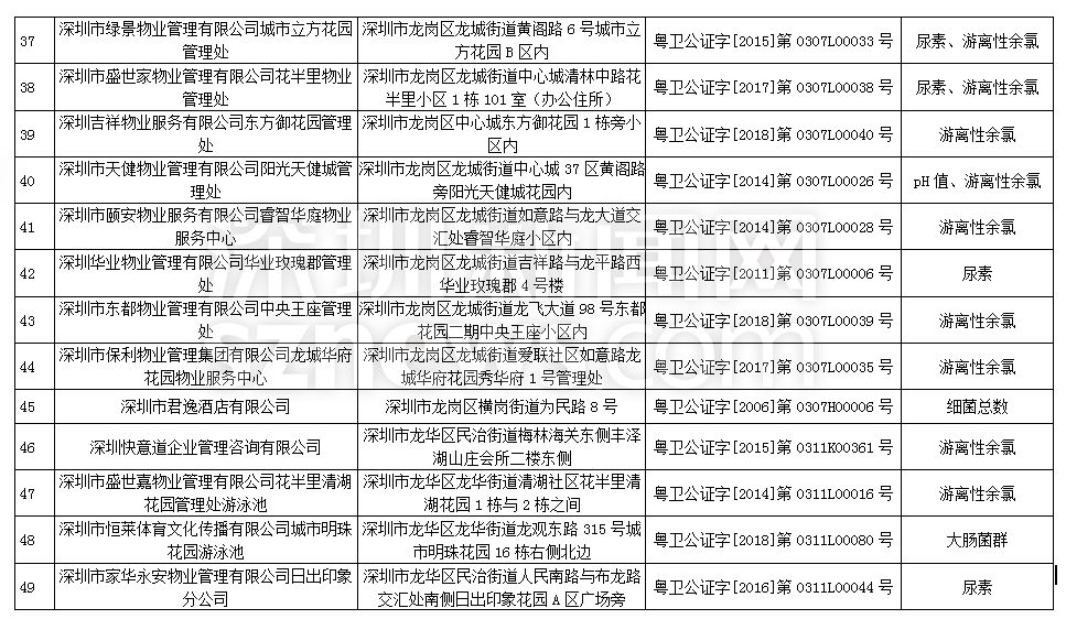 此次檢查結(jié)果顯示,深圳明門(mén)偉健體育服務(wù)有限公司(游泳池)、深圳市綠景物業(yè)管理有限公司城市立方花園管理處(游泳池)、深圳市盛世家物業(yè)管理有限公司花半里物業(yè)管理處(游泳池)尿素、游離性余氯兩項(xiàng)檢測(cè)指標(biāo)不合格,深圳市力美健華聯(lián)健身有限公司(游泳池)pH值、尿素兩項(xiàng)檢測(cè)指標(biāo)不合格,錦龍?bào)w育文化發(fā)展(深圳)有限公司(游泳池)、深圳市安居樂(lè)業(yè)物業(yè)管理有限公司(游泳池)、深圳市天健物業(yè)管理有限公司陽(yáng)光天健城管理處(游泳池)pH值、游離性余氯兩項(xiàng)檢測(cè)指標(biāo)不合格,此外,有45家游泳場(chǎng)所分別因pH值、尿素、游離性余氯、細(xì)菌總數(shù)以及大腸菌群等指標(biāo)不合格被予以通告。衛(wèi)生監(jiān)督部門(mén)已責(zé)令抽檢結(jié)果不合格單位立即整改。