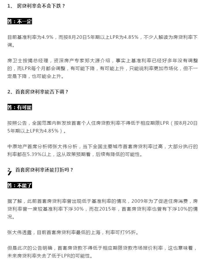全國(guó)范圍內(nèi)新發(fā)放首套個(gè)人住房貸款利率不得低于相應(yīng)期限LPR(按8月20日5年期以上LPR計(jì)算為4.85%);