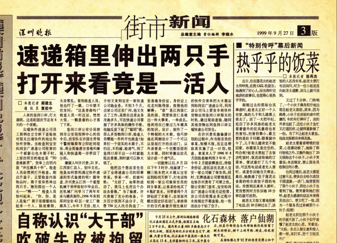 而歷史賦予這支鐵軍的特殊使命任務則是重拳打擊口岸走私和偷渡犯罪?;蕧徔诎杜沙鏊下毠す疱a梁至今還珍藏著一份些許泛黃的舊報紙,一篇名為“速遞箱里伸出兩只手,打開來看竟是一活人”的報道記錄了1999年9月22日曾發(fā)生的一起偷渡案件。作為當時參與處置的一員,桂錫梁回憶道,犯罪分子將自己裝進一個特制的大木箱中,偽裝成裝有“沖壓模具”發(fā)往香港的快遞箱,計劃偷渡出境,最終在位于皇崗口岸附近的快遞轉(zhuǎn)運點被警方查獲。