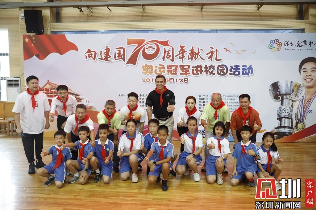 奧運(yùn)冠軍們和學(xué)生合影留念。