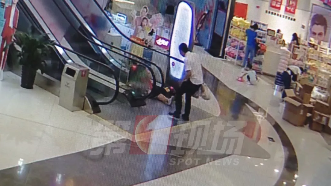 坪山嘉鄰中心商場的監(jiān)控顯示:下午3點(diǎn)左右,李女士帶著2歲多的兒子,從商場二樓下到一樓,在自動扶梯上,李女士突然蹲下來拉住了兒子的右腿,大聲呼救。
