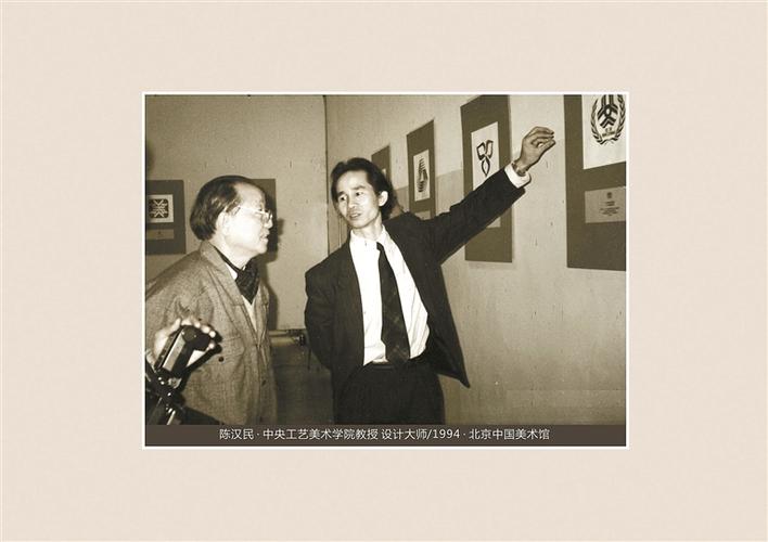 ▲1994年,《莊玉君標(biāo)徽設(shè)計(jì)書(shū)畫(huà)展》在中國(guó)美術(shù)館展出,莊玉君向中央工藝美術(shù)學(xué)院教授陳漢民介紹標(biāo)徽。
