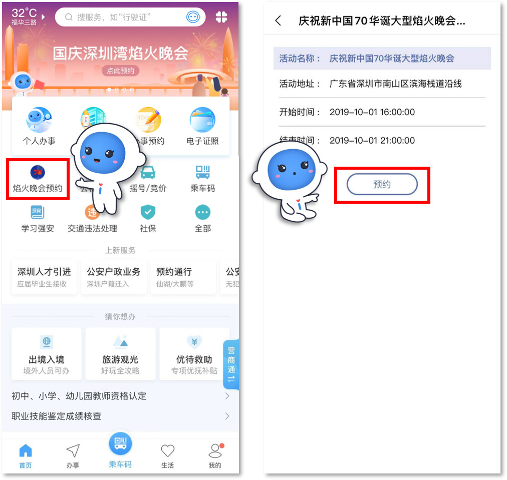2.點(diǎn)擊首頁(yè)頂部圖片或焰火晚會(huì)預(yù)約入口進(jìn)入預(yù)約頁(yè)面,點(diǎn)擊預(yù)約: