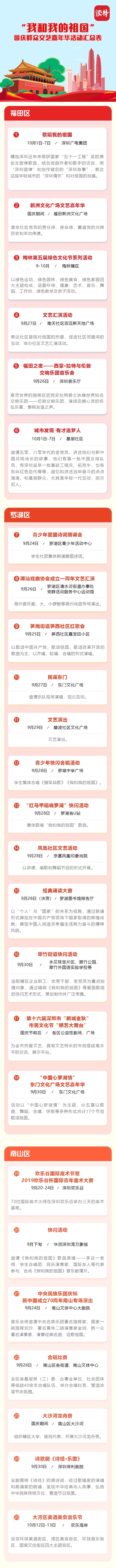深圳特區(qū)報(bào)2019年9月26日訊 為熱烈慶祝中華人民共和國(guó)成立70周年,深圳市將舉辦規(guī)模盛大的全市性專場(chǎng)音樂(lè)會(huì)、群眾文藝晚會(huì)、焰火晚會(huì)等活動(dòng),同時(shí)將在各區(qū)舉辦80場(chǎng)“我和我的祖國(guó)”國(guó)慶群眾文藝嘉年華活動(dòng),并在全市各區(qū)舉行“愛(ài)我中華——南粵百園慶國(guó)慶”主題游園。各有關(guān)活動(dòng)安排如下: