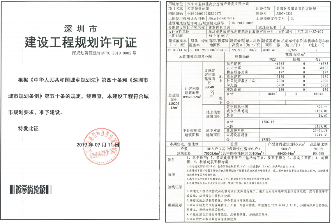 公告顯示,深圳市鹽田佳兆業(yè)房地產(chǎn)開發(fā)有限公司的四期御景佳園項目(鹽田三、四村和西山嚇村整體搬遷項目5號地塊),位于鹽田區(qū)鹽田港后方陸域J307-0331號宗地,用地面積18514.16平方米,允許建設(shè)總建筑面積88040平方米,其中住宅46583平方米、人才公寓30100平方米。本期住宅1018戶,其中保障性住房496戶。