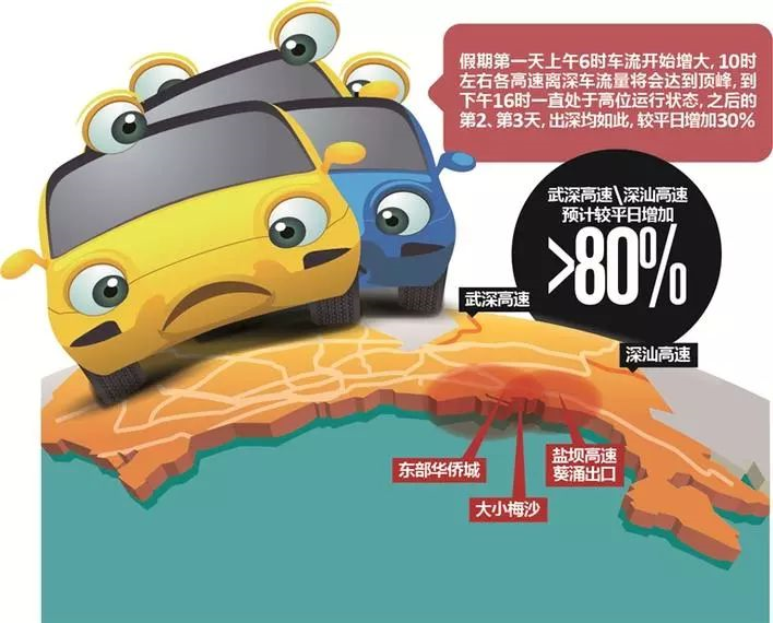 ⑩深圳交警預(yù)測(cè)全市從9月30日下午開始交通流量加大,9月30日、10月1日出行量達(dá)到頂峰。各高速公路、市內(nèi)各景點(diǎn)、商圈、購(gòu)物點(diǎn)以及東部景區(qū)會(huì)出現(xiàn)不同程度的擁堵,全市各區(qū)羅湖區(qū)最為擁堵,其次是福田區(qū)、南山區(qū)。預(yù)計(jì)‘國(guó)慶’期間,全市出深和入深車輛總數(shù)均將超過170萬輛。