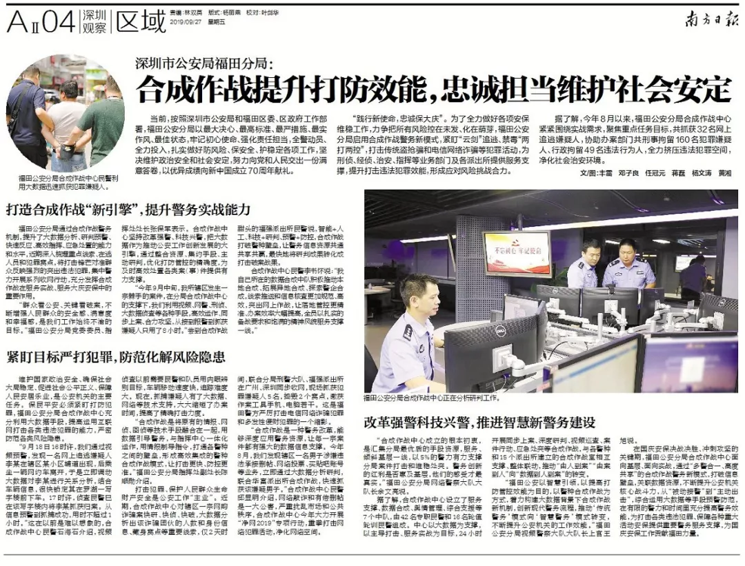 踐行新使命,忠誠保大慶。為了全力做好各項安保維穩(wěn)工作,力爭把所有風險控在未發(fā)、化在萌芽,福田公安分局啟用合成作戰(zhàn)警務新模式,緊盯“云劍”追逃、禁毒“兩打兩控”,打擊傳統(tǒng)盜搶騙和電信詐騙以及“颶風”行動等專項行動,為刑偵、經(jīng)偵、治安、指揮等業(yè)務部門及各派出所服務支撐,提升打擊違法犯罪效能,形成應對風險挑戰(zhàn)合力。