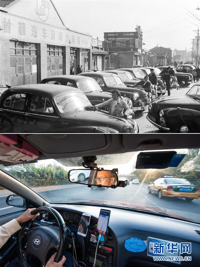 拼版照片:上圖為1965年,北京首都汽車公司職工在出租站擦洗汽車(新華社記者鄭震孫攝);下圖為2019年8月25日,北京新月聯(lián)合出租汽車公司司機穆懷東一邊運送乘客,一邊通過網約車手機平臺接收訂單信息(新華社記者張笑宇攝)。