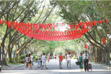 深圳晚報2019年10月04日訊 百花競艷紅旗飄,金秋鵬城節(jié)味濃。栩栩如生的“鳳凰飛羽”花帶沿著深南大道展翅欲飛;約500條城市道路上超10萬面國旗迎風(fēng)招展,化身紅色海洋;蓮花山公園、筆架山公園等22家市政公園變身繽紛花?!瓏鴳c游園,滿眼蒼翠、花團錦簇、生機勃勃。深圳這座“千園之城”以熱烈、喜慶、祥和的面貌為市民帶來了歡愉和快樂。