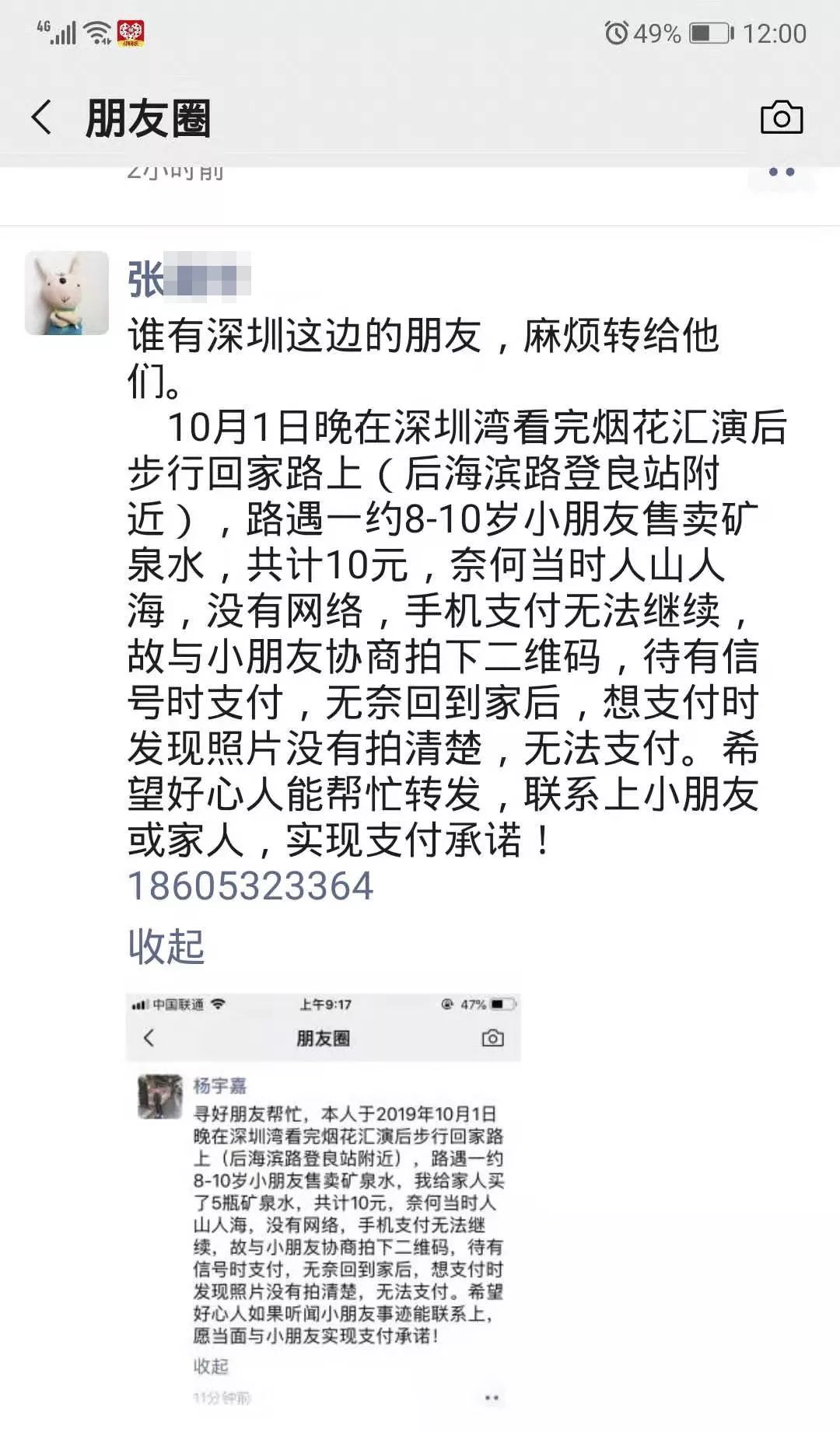 “10月1日晚,在深圳灣看完煙花表演后步行回家路上,路遇一約8-10歲小朋友售賣礦泉水,共計10元,奈何當(dāng)時人山人海,沒有網(wǎng)絡(luò)信號,手機(jī)無法支付,故與小朋友協(xié)商拍下二維碼,待有信號時支付,無奈回到家后,想支付時發(fā)現(xiàn)照片沒有拍清楚,無法支付。希望好心人能幫忙轉(zhuǎn)發(fā),聯(lián)系上小朋友或家人,實(shí)現(xiàn)支付承諾!”