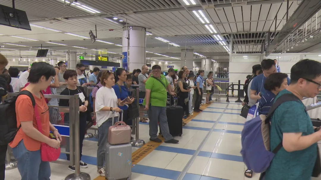 10月5日中午12點,在皇崗口岸的入境大廳,有不少旅客提著大包小包的行李準(zhǔn)備排隊過關(guān)。整個入境大廳15條自助通道和13條人工通道已經(jīng)全部開啟,排隊過關(guān)的市民都可以在3分鐘之內(nèi)快速通關(guān)。