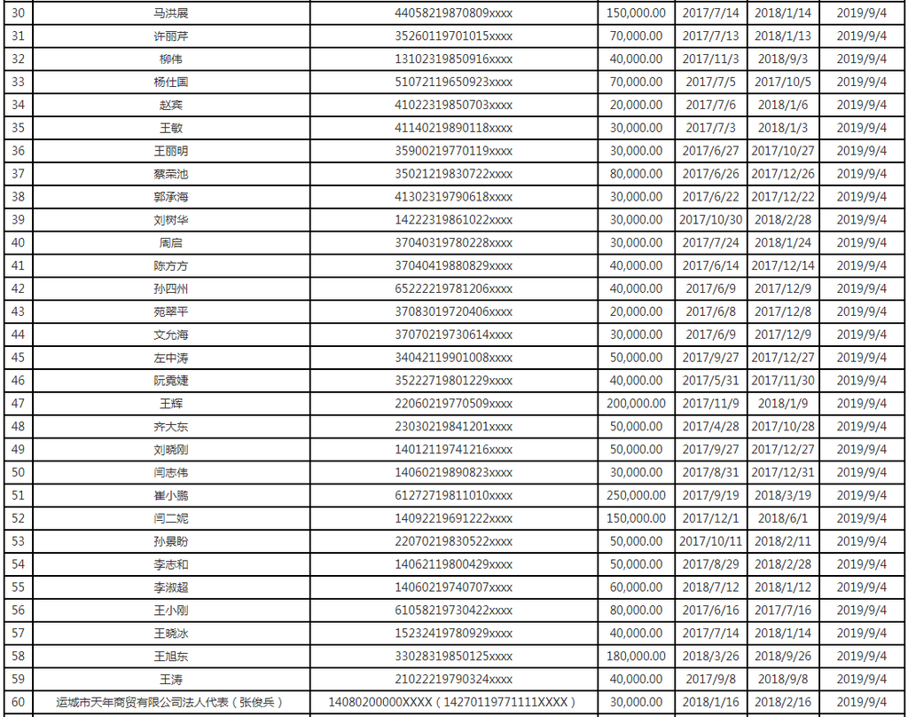 據深圳市地方金融監(jiān)督管理局披露的網絡借貸信息中介機構失信人信息表顯示,74名失信網貸借款人中,有5名是企業(yè)的法人代表,分別為運城市天年商貿有限公司法人代表張俊兵、益陽市逸晨貿易有限公司法人代表熊迎春、南寧市亮輝二手車交易有限責任公司法人代表肖傳富、清徐縣樂村淘電子商務有限公司法人代表羅棟及運城市韓大汽車銷售服務有限公司法人代表韓立哲。其中,運城市韓大汽車銷售服務有限公司法人代表韓立哲逾期金額居首,達到了100萬元,借款時間是2018年4月2日,逾期開始時間是2018年10月2日,截至2019年10月9日已逾期一年多。