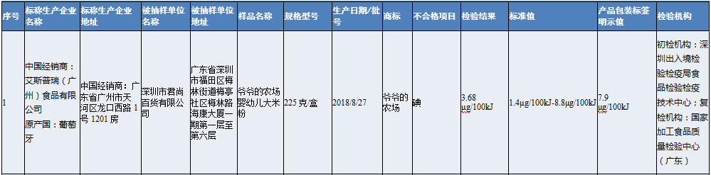 深圳市君尚百貨有限公司銷售的爺爺?shù)霓r場嬰幼兒大米粉(原產國:葡萄牙),其中碘檢出值低于產品包裝標簽明示值的80%,營養(yǎng)指標不達標。