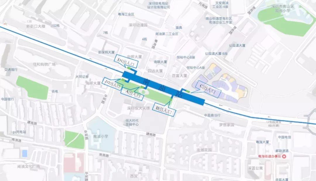 9號線二期南油站位于南山區(qū)南海大道與登良路交叉口下方,沿南海大道呈南北向敷設(shè),為地下2層車站,地下一層為站廳層,地下二層為站臺層,車站總長334m,車站出入口共計(jì)5個A出入口、B出入口、C出入口、D1出入口、D2出入口。B出入口位于恒大天璟北側(cè),C出入口位于來福士廣場一側(cè)登良路與南海大道交匯處,D1出入口位于金暉大廈東側(cè),A、D2出入口位于南海大道與華明路交匯處。