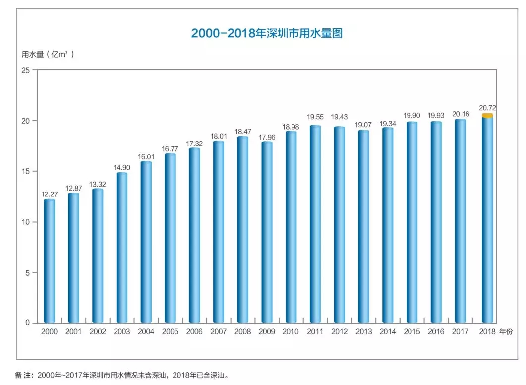 2000-2018年,深圳市用水量整體呈現(xiàn)遞增趨勢(shì)。2018年,深圳市(未含深汕合作區(qū))萬元GDP用水量8.41立方米,位列全國大城市前列。