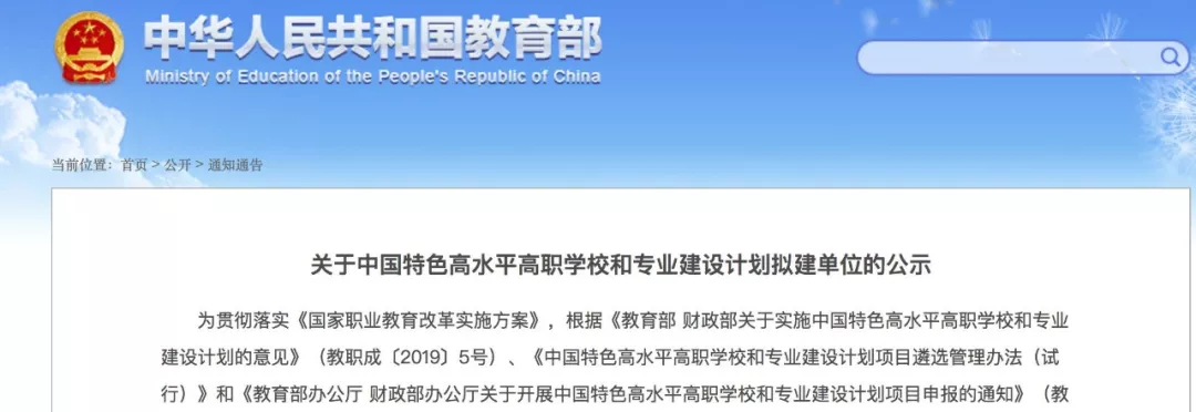 今天上午,教育部和財政部正式發(fā)布《關(guān)于中國特色高水平高職學(xué)校和專業(yè)建設(shè)計劃擬建單位的公示》,經(jīng)高職學(xué)校自愿申報,省級教育部門、財政部門審核推薦,中國特色高水平高職學(xué)校和專業(yè)建設(shè)計劃項(xiàng)目建設(shè)咨詢專家委員會評審,教育部、財政部審定,擬立項(xiàng)中國特色高水平高職學(xué)校和專業(yè)建設(shè)計劃建設(shè)單位197個(簡稱“雙高計劃”),現(xiàn)予公示。公示期7天(2019年10月25日—10月31日)。