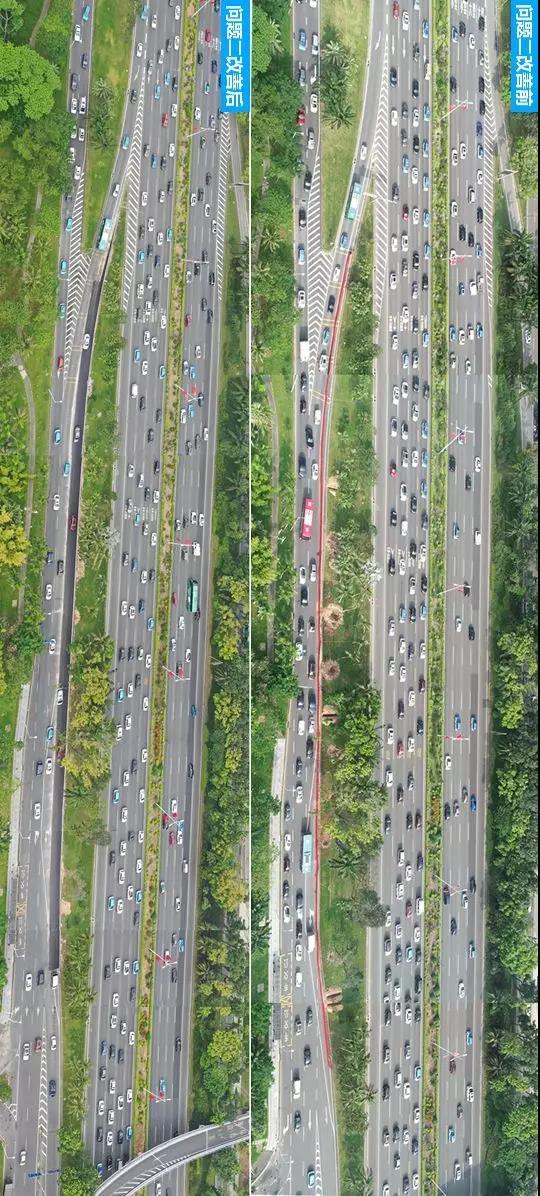 這一次改造歷時4個月,目前通行數(shù)據(jù)顯示,該路段總體運行效率較改善前提升12%,高峰期路段平均車速由改善前的22.4km/h提高到40.4km/h。