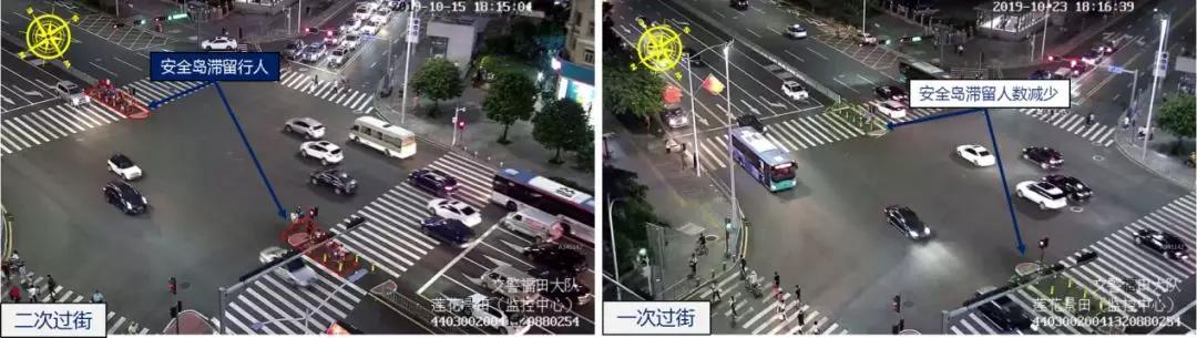 針對現(xiàn)狀問題,深圳交警采用單周雙次的信控策略,小批量、多頻次地放行嘉賓路方向車輛,緩解因公交車隊(duì)列化導(dǎo)致路口交通鎖死的問題;同時,采用行人專用相位集中放行行人,保障行人過街安全。路口優(yōu)化后,路口“回堵”現(xiàn)象顯著減少,行人過街安全性提高,路口高峰小時通過量從2130pcu/h增至2285pcu/h,上升7.28%。