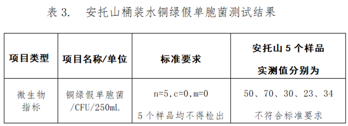 值得注意的是,安托山包裝飲用水檢出銅綠假單胞菌不符合國家標準要求,其他11款桶裝水的微生物指標均符合國家要求。經反饋,生產廠家深圳市廣進源飲品有限公司回函聲稱不是他們公司生產的產品,但截至發(fā)稿廠家并未提供任何證明材料。