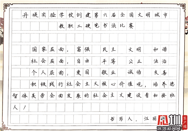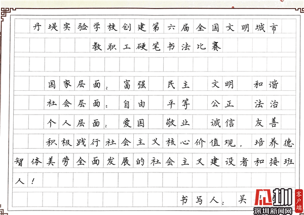 見圳客戶端·深圳新聞網(wǎng)10月29日訊(見圳客戶端、深圳新聞網(wǎng)記者 潘寶儀 通訊員 袁小俊 圖/朱雅琪 ) 為落實(shí)立德樹人總目標(biāo)、培育和踐行社會(huì)主義核心價(jià)值觀,創(chuàng)建文明城市,積極倡導(dǎo)全校教職工勤練教學(xué)基本功,提高教師綜合素養(yǎng),豐富課余生活,展示丹堤實(shí)驗(yàn)學(xué)校教職工風(fēng)采,學(xué)校于10月25日舉行了“創(chuàng)建第六屆全國(guó)文明城市教職工硬筆書法比賽”。