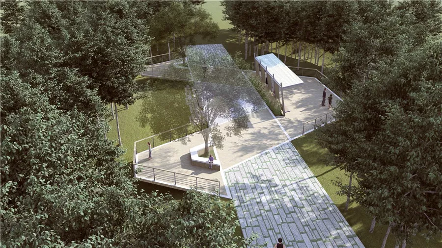 利用現(xiàn)狀平臺進行改造提升,場地形式由“人”字演化而來,廊架也取自“人”形元素進行設(shè)計,平臺北向俯瞰群賢廣場,南面則朝向求知花園,具有一攬眾英才之意。