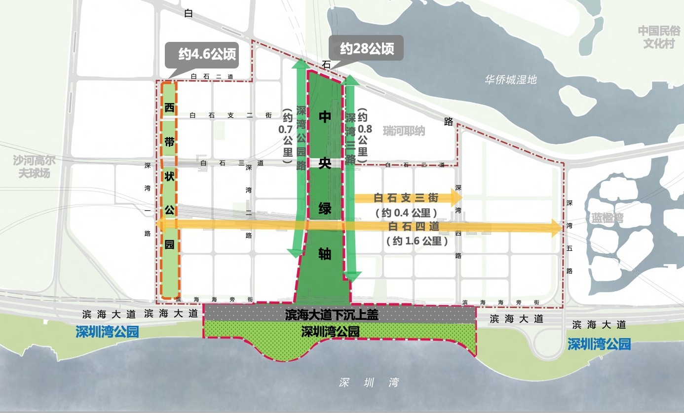 國際咨詢的重點(diǎn)設(shè)計(jì)范圍為中央綠軸(約28公頃,含濱海大道下沉上蓋和深圳灣公園部分區(qū)域)(含深灣公園路、深灣三路街道空間)、片區(qū)重要街道(白石四道、白石支三街)、西帶狀公園(約4.6公頃)等。