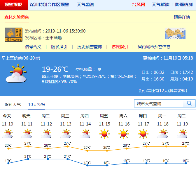 見圳客戶端·深圳新聞網(wǎng)2019年11月10日訊 深圳市氣象臺預(yù)計(jì)10-11日晴天間多云,空氣非常干燥,早晚清涼,10日氣溫19-26℃;12日云量增多,13-14日受冷空氣影響,北風(fēng)明顯加大,氣溫下降;15-17日晴天干燥,早晚清涼。