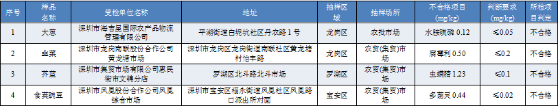 見圳客戶端·深圳新聞網(wǎng)2019年11月12日訊 11月11日,深圳市市場監(jiān)督管理局發(fā)布9月16日-9月20日深圳市農(nóng)產(chǎn)品質(zhì)量安全豬肉和蔬菜例行監(jiān)測結(jié)果。2019年9月16日-9月20日,深圳市市場監(jiān)督管理局在全市監(jiān)測豬肉產(chǎn)品53份,抽檢結(jié)果顯示全部樣品合格。抽檢蔬菜共124份,4份抽樣樣品不合格,都為農(nóng)藥檢測超標(biāo)。其中,深圳市海吉星國際農(nóng)產(chǎn)品物流管理有限公司銷售的大蔥水胺硫磷超標(biāo),深圳市龍崗南聯(lián)股份合作公司黃龍?zhí)潦袌鲣N售的韭菜腐霉利超標(biāo),深圳市集貿(mào)市場有限公司惠民街市文錦分店銷售的芥藍(lán)蟲螨腈超標(biāo),深圳市鳳凰股份合作公司鳳凰綜合市場銷售的食莢豌豆多菌靈超標(biāo)。