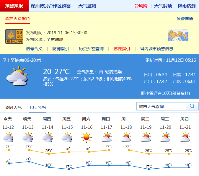 深圳市氣象局預計12日多云,早晚有輕霧或輕度霾,空氣干燥, 氣溫20-27℃;東北風2-3級;相對濕度40%-90% 。12日多云,早晚有輕霧或霾,20-27℃;13日夜間至14日有冷空氣影響,風力加大,最大陣風7-8級,氣溫下降3℃左右;15-18日晴天。
