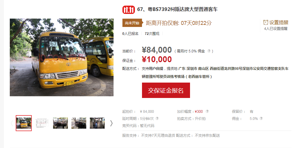 當(dāng)前價(jià)最高的為粵BS7392柯斯達(dá)牌大型普通客車(chē),為84000元。