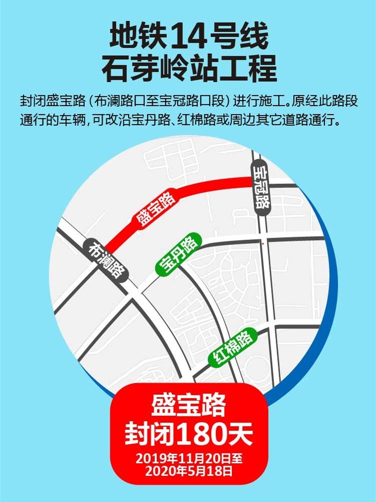 2019年11月20日至2020年5月18日共180天,封閉盛寶路(布瀾路口至寶冠路口段)進行施工。原經(jīng)此路段通行的車輛,可改沿寶丹路、紅棉路或周邊其它道路通行。