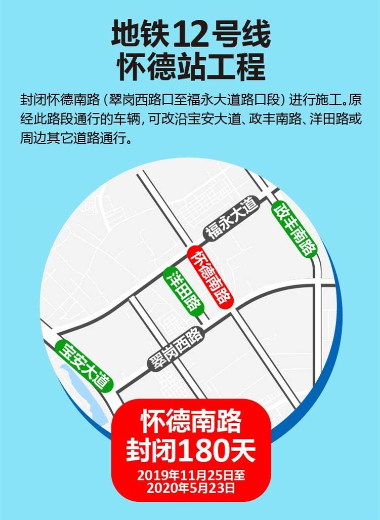 2019年11月25日至2020年5月23日共180天,封閉懷德南路(翠崗西路口至福永大道路口段)進行施工。原經(jīng)此路段通行的車輛,可改沿寶安大道、政豐南路、洋田路或周邊其它道路通行。