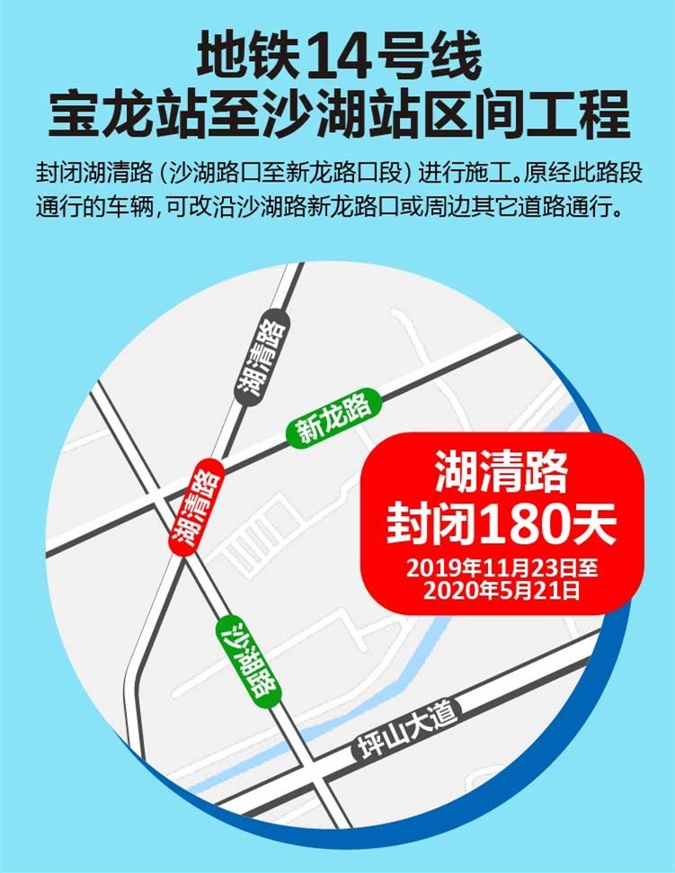 2019年11月23日至2020年5月21日共180天,封閉湖清路(沙湖路口至新龍路口段)進(jìn)行施工。原經(jīng)此路段通行的車輛,可改沿沙湖路新龍路口或周邊其它道路通行。