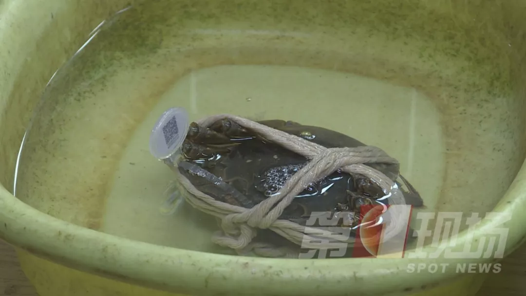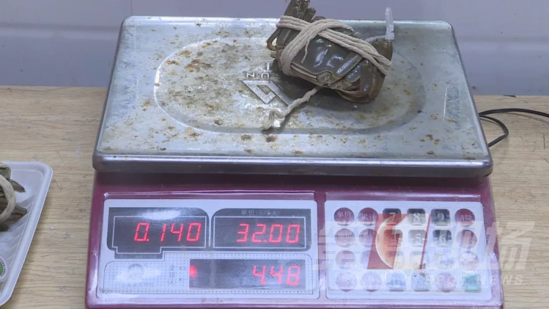即便記者將綁蟹的繩子,浸泡在水中三分鐘后,帶著水分再次稱重,母蟹的重量也依然不足稱。