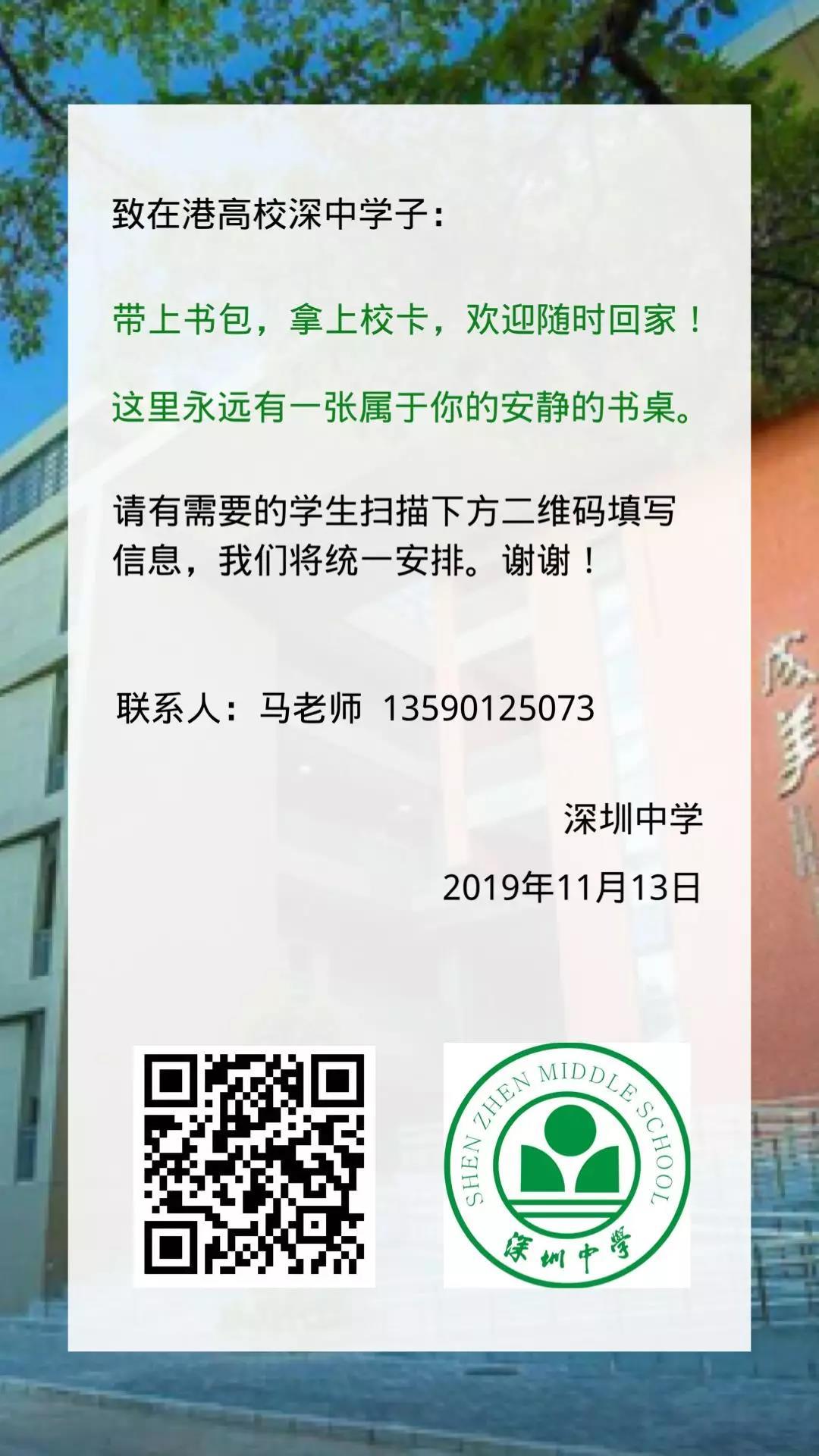 見(jiàn)圳客戶端·深圳新聞網(wǎng)2019年11月14日訊 繼香港中文大學(xué)(深圳)發(fā)文表示為內(nèi)地在港就讀學(xué)生提供臨時(shí)免費(fèi)住宿后,深圳中學(xué)今天也在官方微信公號(hào)中致信在港高校深中學(xué)子,只要拿上校園卡,深中隨時(shí)歡迎學(xué)子們回家!學(xué)校將對(duì)有需要的學(xué)生統(tǒng)一進(jìn)行安排。