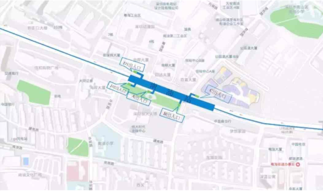 高新南站位于白石路上沿白石路東西向布置,車站出入口共計(jì)4個(gè),其中A、B出入口接科技生態(tài)園,C出口靠豪威科技大廈,D出口通向科技南路方向。