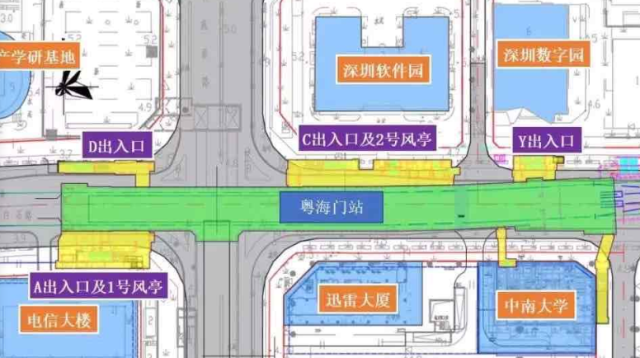 粵海門站位于白石路與科苑南路交叉口處,車站出入口共計(jì)4個,其中A出入口位于電信大樓旁,D出入口位于深港產(chǎn)學(xué)研基地旁,C、Y出入口位于白石路北側(cè),靠近深圳軟件園及數(shù)字園。