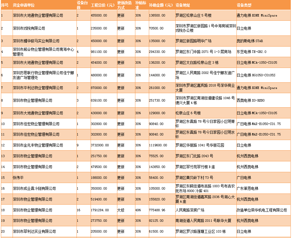 見圳客戶端·深圳新聞網(wǎng)2019年11月15日訊 11月13日,深圳市市場(chǎng)監(jiān)督管理局羅湖監(jiān)管局發(fā)布關(guān)于2019年羅湖區(qū)老舊電梯更新改造大修補(bǔ)助名單的公示,公示稱,為推進(jìn)羅湖區(qū)老舊電梯更新改造大修工作,保障市民群眾生命安全,羅湖區(qū)施行老舊電梯更新改造大修補(bǔ)助政策。2019年,經(jīng)專家現(xiàn)場(chǎng)驗(yàn)收,羅湖區(qū)共有41家申請(qǐng)單位的112臺(tái)老舊電梯更新改造大修工程通過(guò)驗(yàn)收(其中更新84臺(tái)、改造12臺(tái),大修16臺(tái)),涉及工程總價(jià)3084.57萬(wàn)元,發(fā)放補(bǔ)助資金9640009.05元。
