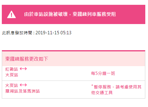 港鐵于今早05:05發(fā)布通告稱,港鐵各線列車服務(wù)延誤或受阻,經(jīng)詳細(xì)風(fēng)險(xiǎn)評(píng)估及相關(guān)政府部門商討后,港鐵各線(機(jī)場快線除外)、輕鐵及港鐵巴士的服務(wù)將于晚上10時(shí)結(jié)束。由頭班車起,東鐵線大學(xué)至羅湖及落馬洲站暫時(shí)關(guān)閉,列車也不停相關(guān)車站。