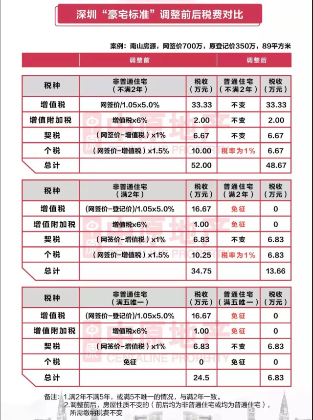 深圳“豪宅標(biāo)準(zhǔn)”調(diào)整前后稅費(fèi)對(duì)比。來自深圳中原研究中心