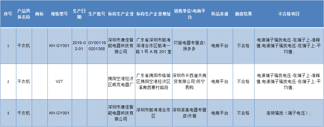 晶報(bào)2019年11月20日訊 近日,江蘇省市場監(jiān)管局對(duì)衣物干燥機(jī)產(chǎn)品質(zhì)量進(jìn)行了監(jiān)督抽查,共抽查50批次。抽查結(jié)果顯示,合格30批次,不合格20批次。其中,深圳有3批次不合格。分別是深圳市康佳智能電器科技有限公司生產(chǎn)的2批次干衣機(jī),及揭陽空港經(jīng)濟(jì)區(qū)威克電器廠生產(chǎn)的在深圳市卡西道夫商貿(mào)有限公司、蘇寧易購等電商平臺(tái)銷售的干衣機(jī)。