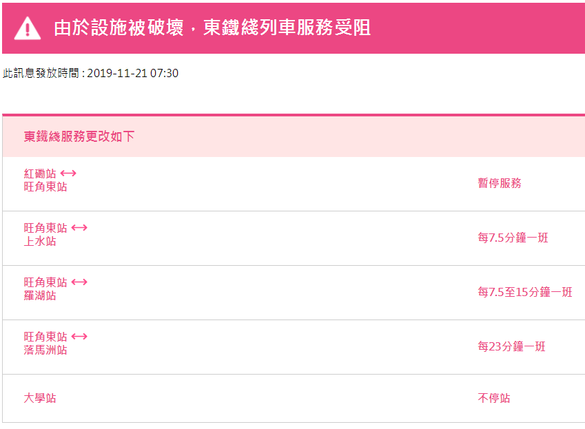 今日,東鐵線提供羅湖站、落馬洲站服務(wù),但行車時間較長,旺角東站至羅湖站每7.5至15分鐘一班,旺角東站至落馬洲每23分鐘一班,紅磡站至旺角東站暫停服務(wù)。西鐵線紅磡站至尖角東站暫停服務(wù)。