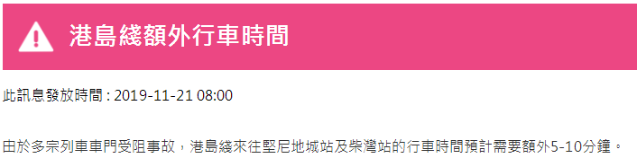 整體行車時間會較平日長16-22分鐘,班次也會較正常疏落。預(yù)計進入車站及在站臺候車的時間會較長,出行需預(yù)留充裕的時間。